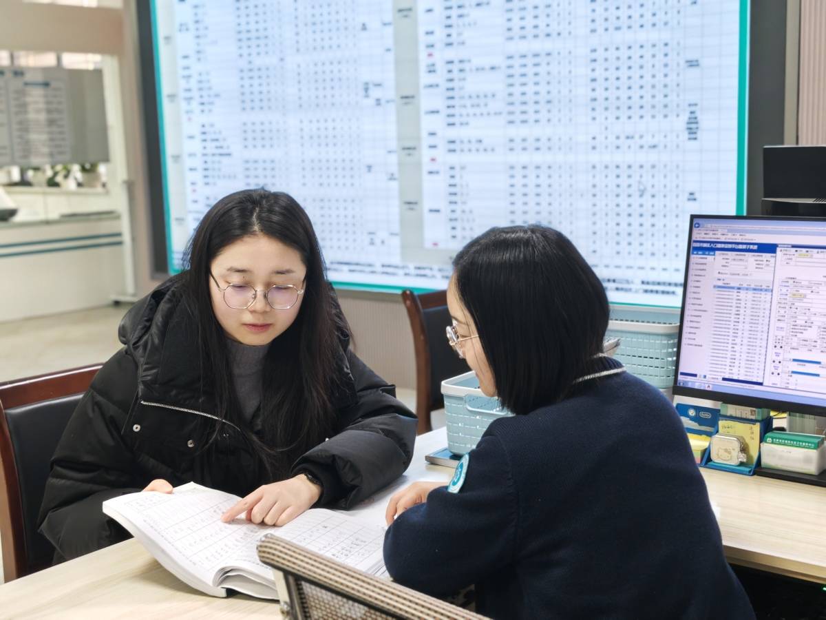 周韩(左)在社区卫生中心了解居民医疗情况 (受访者供图)