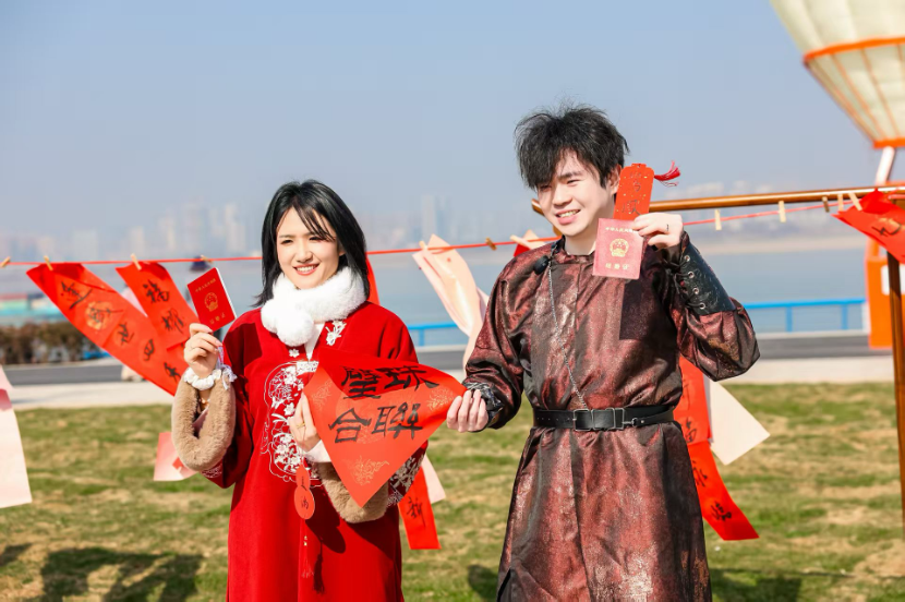 新人们手捧红本本与墨香手幅合影,脸上洋溢着幸福笑容。“刚领完证就收到这样的祝福,既有传统年味,又有专属浪漫,太有意义了!”一对新人拿着刚写好的手幅,喜悦之情溢于言表。