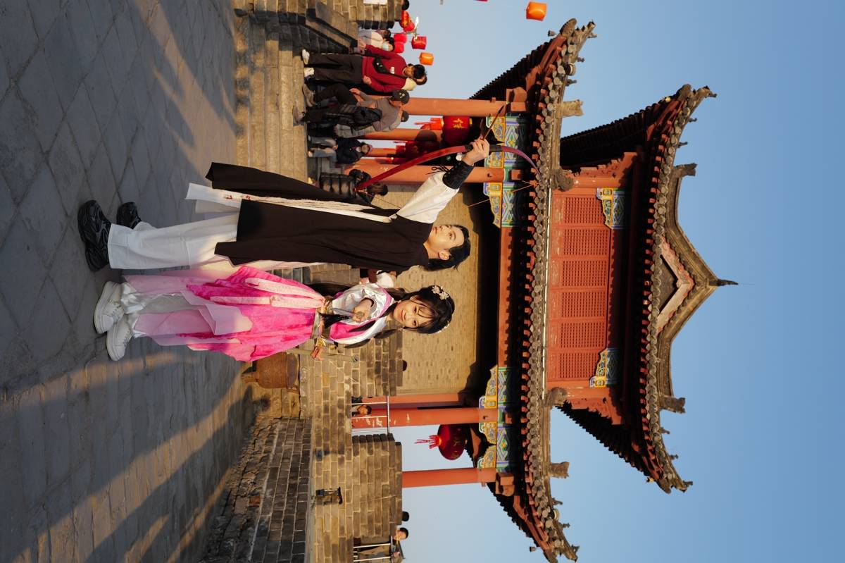 在孩子们的喧闹声中,以“千灯临汉 万户迎春”为主题的新春盛会浓情启幕。尽管寒意未消,市民游客的热情早已将这里点燃。身着汉服的小姐姐们三五成群,倚着古城墙提着花灯盈盈浅笑,裙裾在风中轻扬,与身后的青砖黛瓦构成一幅流动的古今画卷。