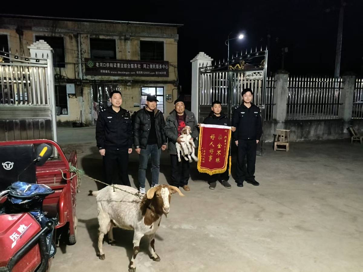 湖北日报讯(记者祝兆林、通讯员丁均睿)“多亏了民警同志和好心村民,不仅帮我找回了怀孕母羊,还多了两只可爱的小羊羔!”2月14日晚,失主王大爷在民警的陪同下,将一面印着“好人好事 拾金不昧”的锦旗送给热心群众李师傅,话语里满是激动与感激。