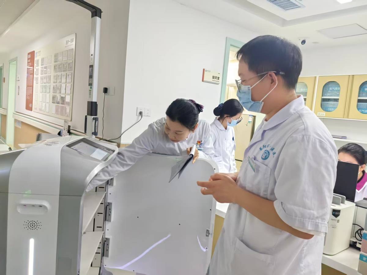 6分钟后,2号机器人抵达康复科护士站。护士长唐亚娟刷脸取药、关闭柜门,机器人随即调头,驶向下一个目的地。