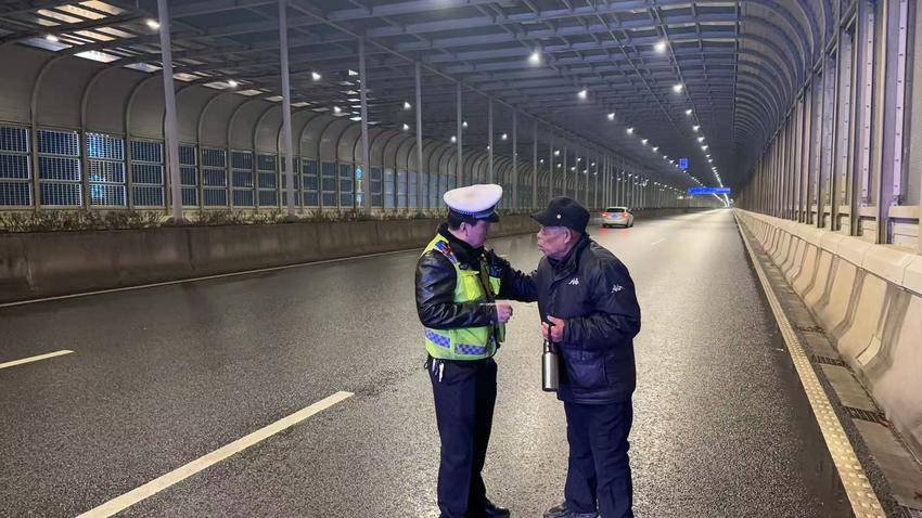 除夕夜9时许,七中队夜巡民警周绍佳与辅警张睿哲在友谊大道高架巡逻时,发现一位老人在快速路上行走,十分危险。