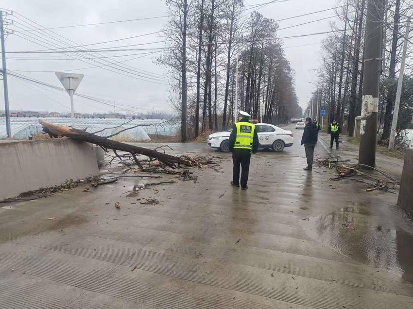 上午9时,八中队民警在巡查中发现绿色路白玉时光公园门口树木被风吹断、电缆挂断脱落,交通受阻。