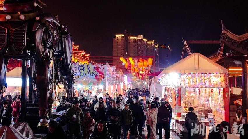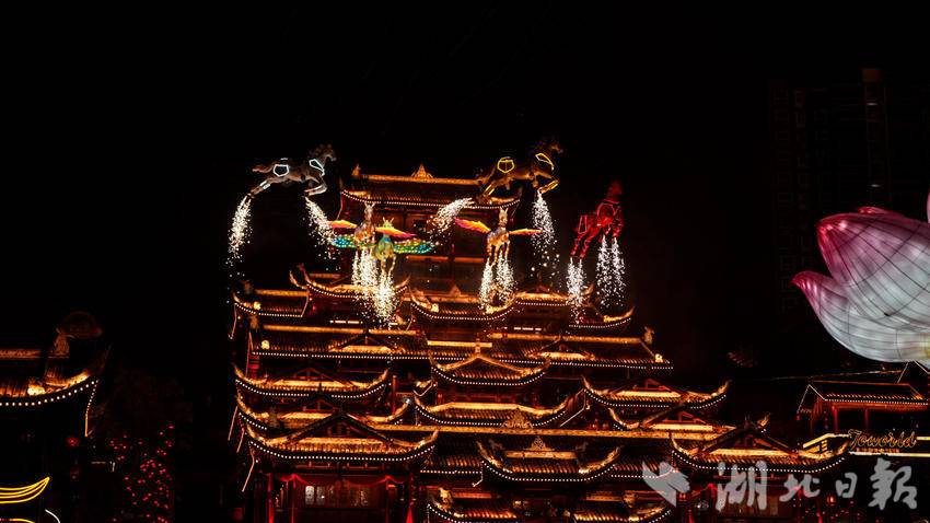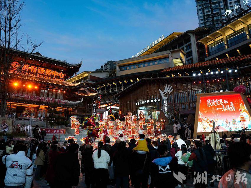 为了让游客尽享新春乐趣,宣恩在2月17日推出了超丰富的节目单,从白天到夜晚,精彩演出轮番上阵,覆盖沉浸式演艺、民俗体验、互动游戏、光影秀等多个品类,遍布莲花灯舞台、墨达楼、兴隆老街、寨遇广场等多个点位。在莲花灯舞台,《一马马骉·祈福》主题活动接连上演,莲花灯灯光秀点灯仪式、七仙女演绎、天马跃贡水等环节依次亮相,将马年祈福的美好寓意融入视觉盛宴;墨达楼前,《土家游戏坊》《墨达楼招亲》等活动趣味十足,土家民俗与互动体验结合,让游客在参与中感受土家文化;兴隆老街则化身“欢乐海洋”,《一锤定音》《古风光影秀》《兴隆曼舞》等节目不间断上演,每15分钟一次的光影与舞蹈表演,让老街时刻充满新鲜感。