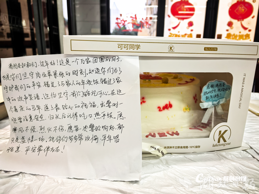 这份礼物虽不贵重,却饱含深情——一盒精心准备的蛋糕,蛋糕上印着鲜红的“福”字,寓意着平安与吉祥;一同送来的,还有一封手写的书信。字里行间,流淌着群众对蔡甸消防救援人员的深深敬意与感激之情。