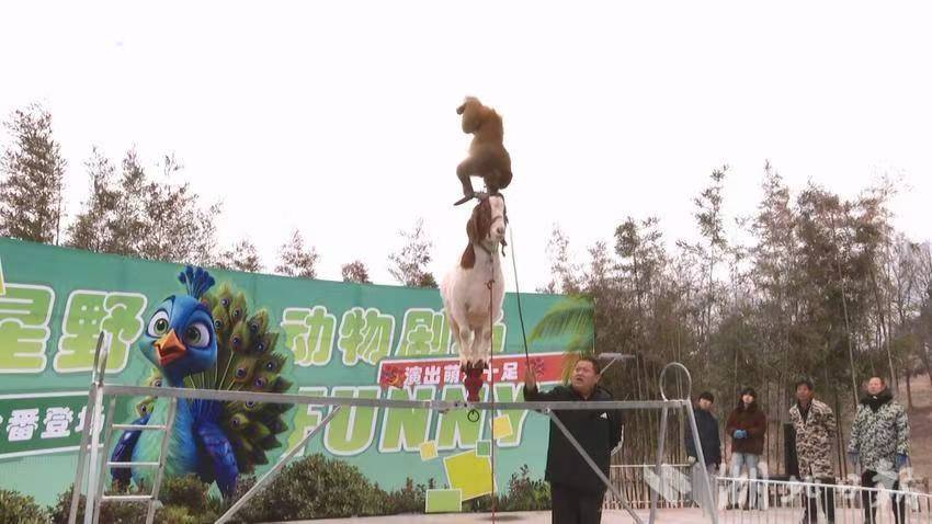 斗鸡过后就是羊背猴表演。当工作人员牵着山羊走上舞台后,一只猕猴小淘气突然一下就爬到了山羊背上。之后山羊背着小猴稳稳地爬上铁梯,走过不足十公分的“独木桥”,然后回到独木桥中间,四条羊腿站在直径十多厘米的圆盘上,小心地移动四蹄转圈。而这时羊背上的小猴则玩起了花样动作,还用前爪握住羊角倒立。这样的表演,需要两个动物有百分之百的信任和默契,山羊的稳定如山,猴子的灵活如风,它们组合在一起,就是最完美的丛林生存示范,也向我们展示了动物世界有趣的共生与协作。