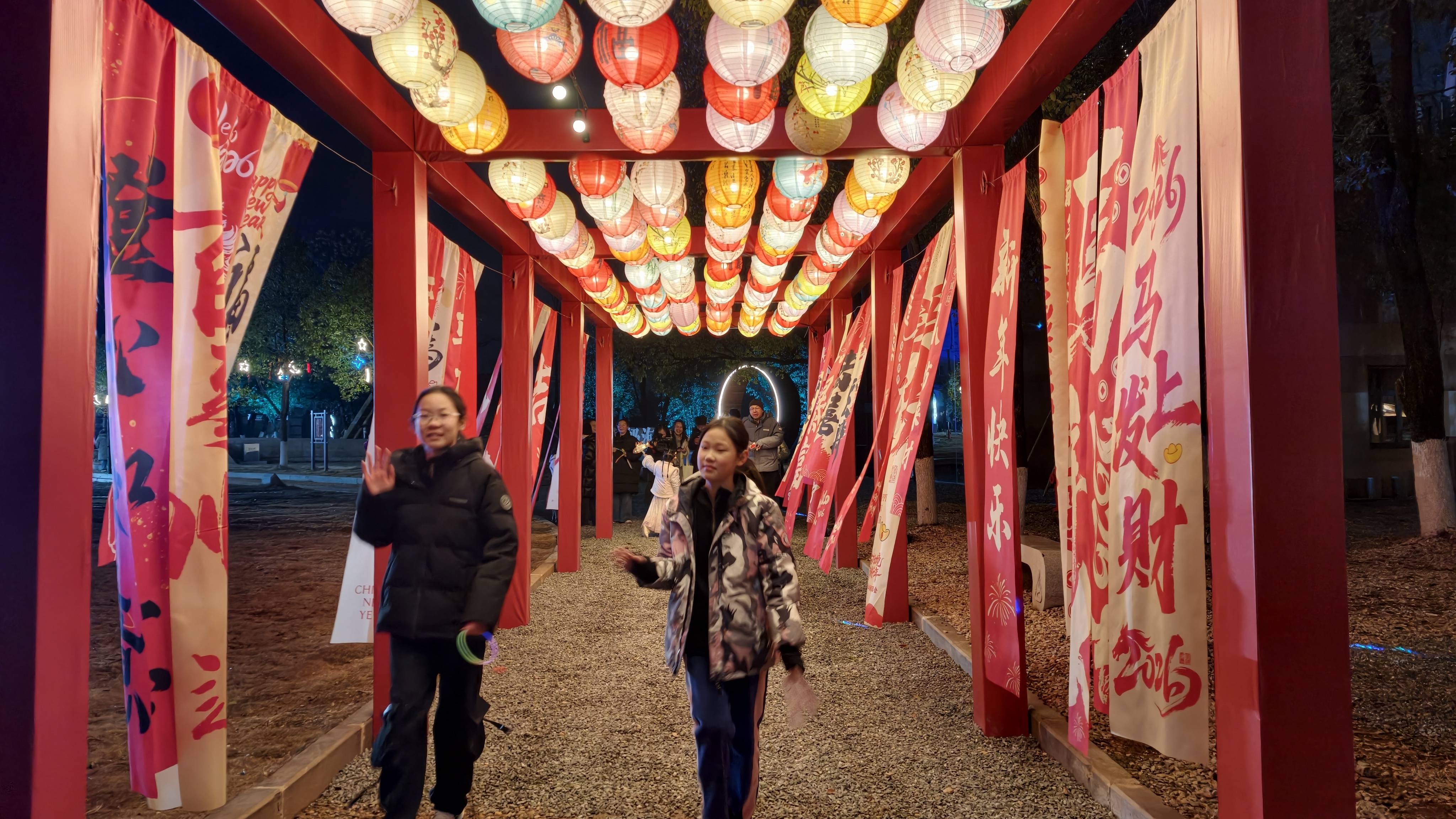 夜幕降临,铜绿山国家考古遗址公园华灯璀璨,喜气洋洋。入园处百米台阶被斑斓的灯光勾勒出轮廓,一步一景,仿佛踏入千年古矿幻境;山体3D灯光秀上,骏马奔腾的灵动身姿、“新年快乐”的喜庆字样轮番投射在山壁之上。光影流转间,千年矿冶的厚重与现代光影技术完美交融,引得游客纷纷拿出手机定格美景,赞叹声此起彼伏。