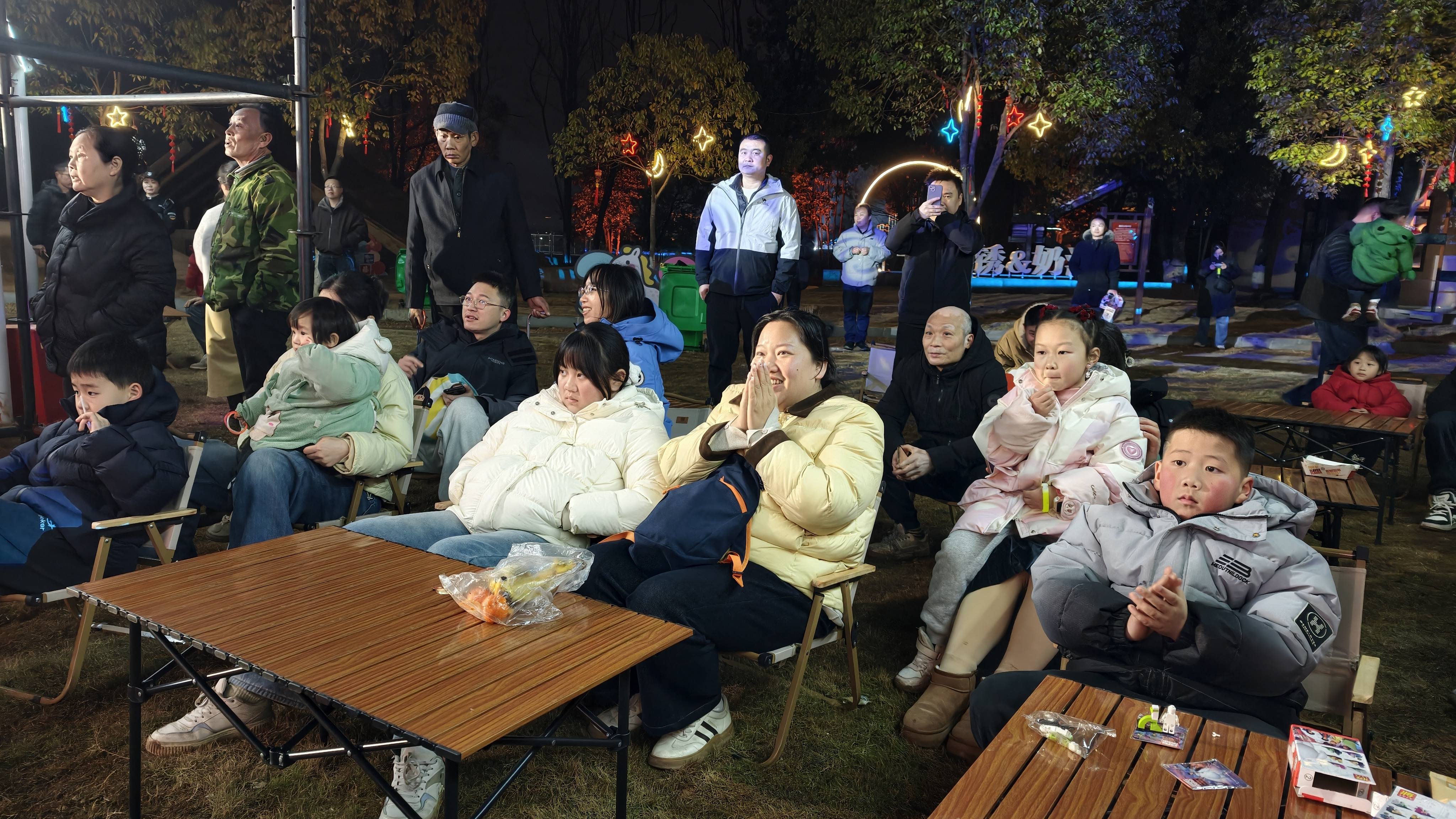 园区内年味浓郁,热闹非凡。草坪上民谣演唱会开唱,悠扬歌声在山间回荡,台下观众或静坐聆听,或轻声跟唱,尽显欢快氛围;专业舞龙舞狮队伍穿梭巡游,腾跃、扑闪等动作行云流水,游客们争相伸手触摸狮身、狮头以求沾福气,并跟随队伍欢呼。
