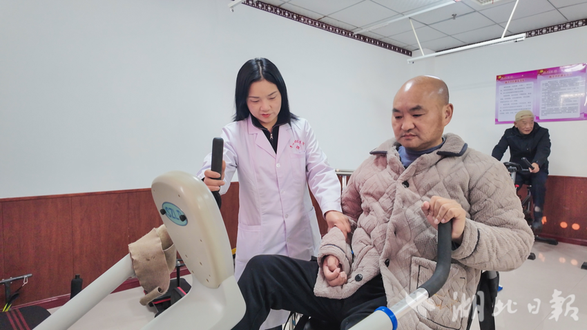 “先拿那只脚,再拿另一只脚,慢慢地。”2月18日正月初二一大早,在崇阳县青山镇卫生院康养中心的健身室里,医生雷大琴正耐心指导王大爷使用平行杠进行康复训练。在这间“适老化”健身室内,平行杠、带扶手的卧式健身车、可调节阻力的肩关节康复器、腿部屈伸训练器……一批专为老年人量身定制的适老化健身器材,处处贴合老年人身体特点。
