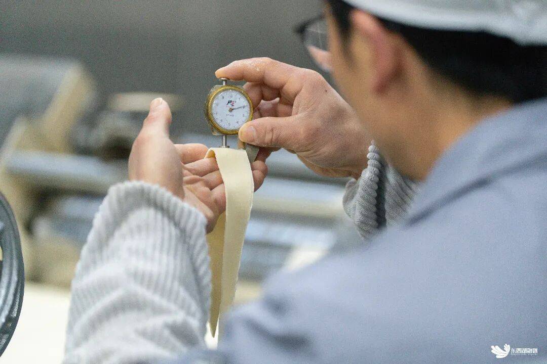 工人正在测量压面厚度。