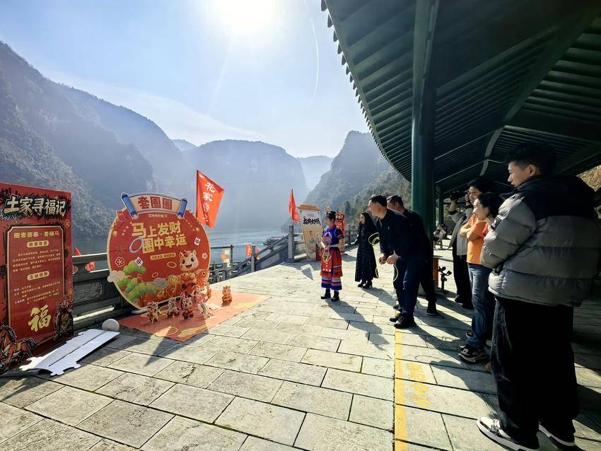 九大福点寻福纳祥。景区精心设置九处福字打卡点,游客集福可兑换福币、赢取文创福礼,形成有趣的“福币经济系统”。风雨楼前,灵驹NPC随机派发福币红包,吸引众多游客合影互动;鼓乐堂里,“媒趣闹春抢福绣”活动高潮迭起,绣球抛出阵阵欢笑;倒影峡驿站,土家山歌对唱此起彼伏,原生态歌声令人陶醉。
