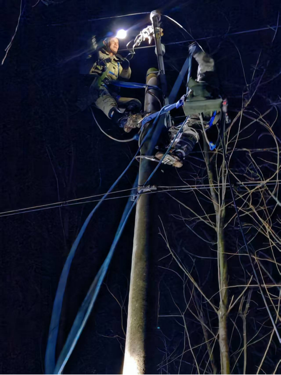 面对恶劣的天气条件和复杂的地理环境,抢修人员没有丝毫退缩。他们手持应急照明灯,扒开杂乱的树枝,踩着泥泞一步步靠近电杆。寒风夹杂着冷雨打在脸上,树枝划破了手背,但没有一个人停下手中的工作。