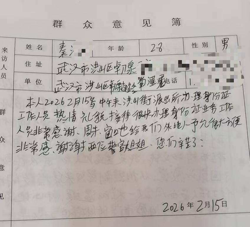 服务“不打烊”的还有户籍窗口。2月15日,一名外地群众因身份证过期,担心影响出行,抱着试试看的心态来到洪山所补办。让他意外的是,户籍窗口不仅开着,民警徐玲还热情地接待了他,引导他完成信息采集、照片拍摄等流程,整个过程高效顺畅。拿到受理回执时,他当场写下好评。