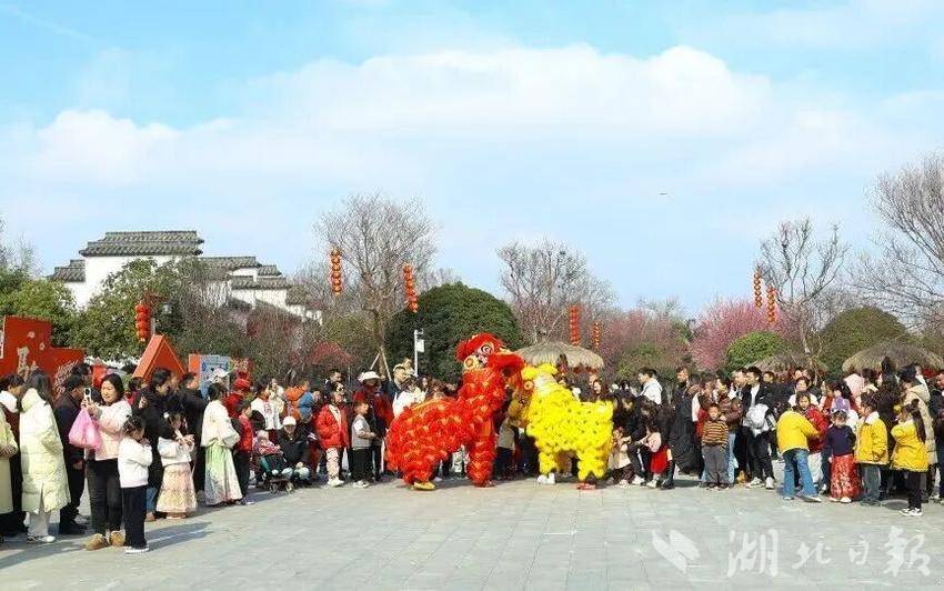 紫薇都市田园迎来客流高峰,接待人次与旅游综合收入双双刷新历史纪录。以“花市迎春·民俗贺岁”为主题的春节庙会持续火热,舞龙舞狮巡游、楚剧折子戏、财神派福等民俗活动轮番上演,非遗剪纸、拓印、糖画体验吸引亲子家庭踊跃参与。带着孩子前来的市民陈先生分享道:“孩子拿着自己做的剪纸特别开心,‘银票’游园游戏让他全程跑个不停,这种又传统又好玩的体验,才是我们记忆里最正宗的年味。”