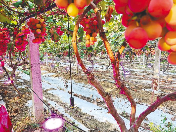 “以前妮娜皇后上色不均、产量偏低。我们到处取经,最后在省农科院专家的指导下找到了解决办法。”园区负责人黄灼初指着葡萄架下银光闪闪的反光膜解释,转色期的葡萄通过膜面反射,能均匀吸收红光与紫外线,促使整串果实红得透亮,糖度也更高。晚上,地面亮起的紫色补光灯继续延长“美颜时间”,增加上色效果。“去年上市,单粒重20克以上,成为市场的‘顶流明星’,每斤卖到50元左右。”