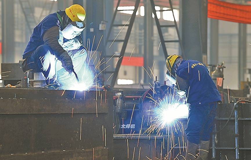 2月24日,正月初八,位于樊城区的中铁十一局集团汉江重工有限公司车间里,工人忙着焊接架桥机部件。(来源:襄阳日报