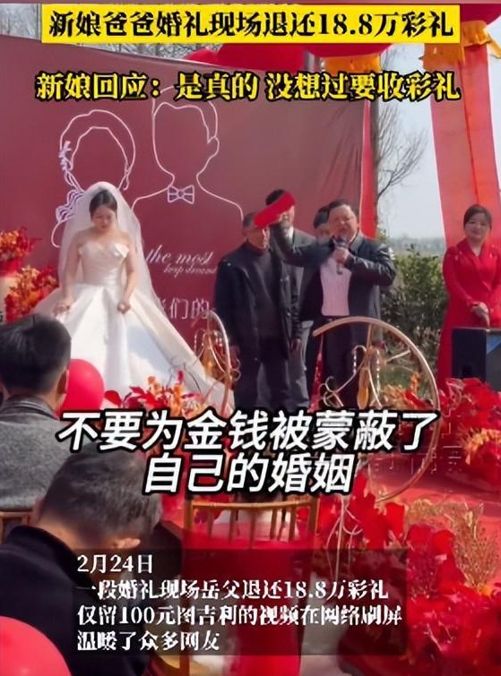 近日,一段“老丈人婚礼现场退还男方18.8万元彩礼”的视频引关注。一对新人在湖南办婚礼时,岳父现场退还男方18.8万元彩礼,只留下100元作为吉祥寓意,并说:“年轻人,不要被金钱蒙蔽了自己的婚姻幸福。”这一举动打动了很多网友。