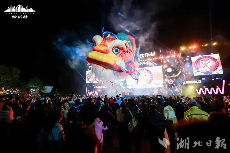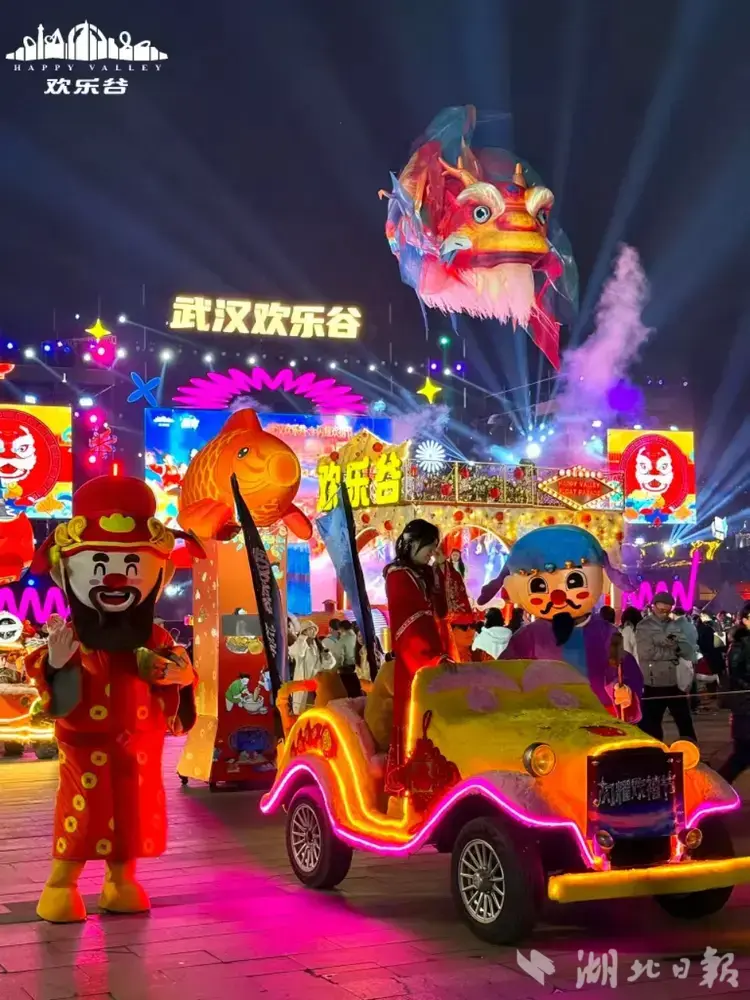 一是鳌鱼飞天大秀:曾亮相全运会的国家级非遗项目"飞天鳌鱼"首次进驻武汉。这条由传统扎作技艺打造的21米幻彩巨鳌,在多人协同操控下于空中腾跃翻飞,气势磅礴。二是非遗打铁花:夜幕降临,非遗匠人将1600°C铁水奋力击向高空,瞬间绽放成漫天金色流星,寓意火树银花不夜天,红红火火过新年。三是新春日夜大巡游:白天是喜庆热闹的"家有喜事"派对,财神团与经典IP派发福气;夜晚则化身“喜气盈门”光影梦境,花车、NPC在灯光与飘雪中营造沉浸式夜游体验。