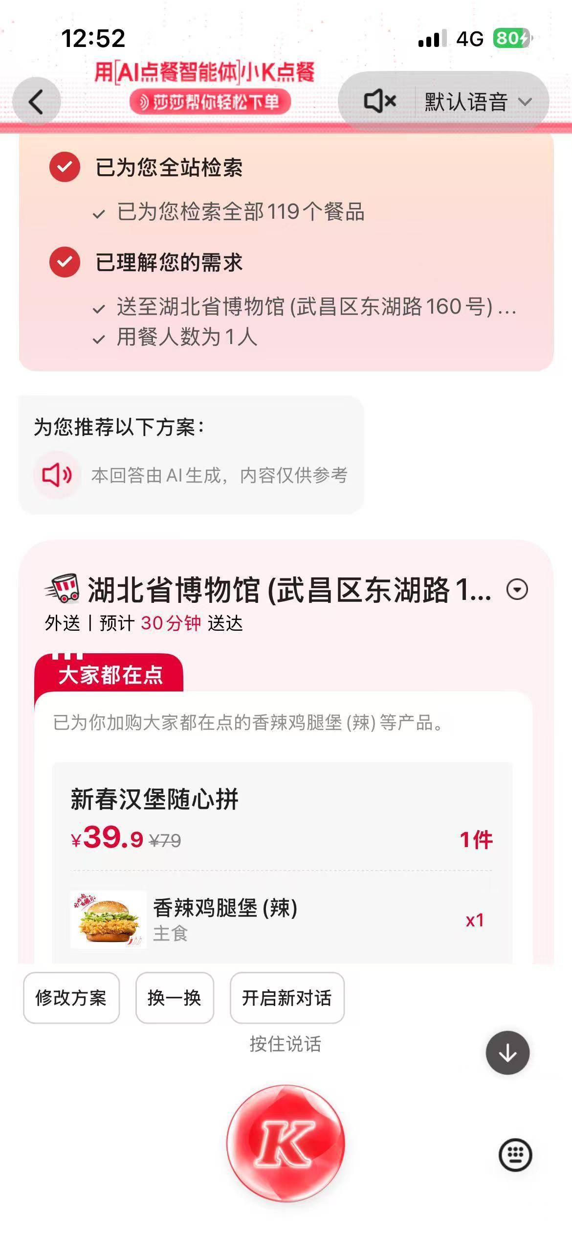 湖北日报讯(记者黄磊、实习生王一荃)近日,肯德基正式上线AI智能点餐Agent小K,用户可在肯德基APP内及部分合作车机上进行语音点单并完成支付。