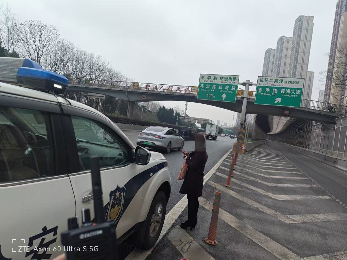 “别怕,我是武汉交警,您怎么会在这里?”10分钟后,黄涛在高架护栏边发现了求助的金女士,她身子微微发抖,神情慌张又无助。经了解,金女士在常青路常青花园转盘附近沿路打车,一时心急,没注意到道路标识,误打误撞走上三环线快速路。等她反应过来时,已经身处高架之上,看着身旁呼啸而过的车辆,既不敢继续往前走,也不敢往回退,只能站在护栏边,颤抖着拨通报警电话。