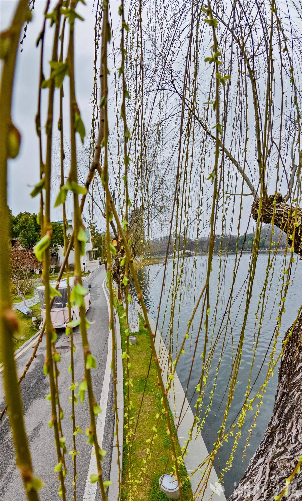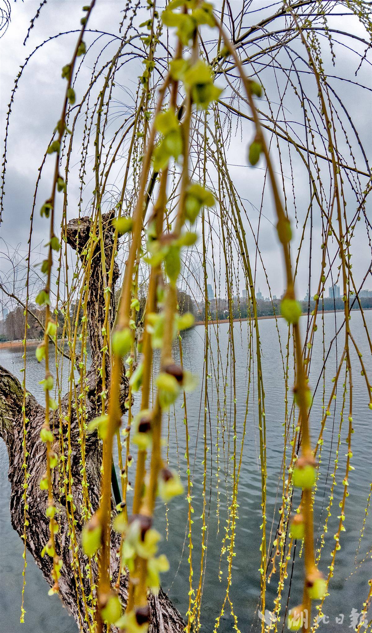 湖边柳丝率先感知到春的讯息,枝头悄悄冒出嫩绿新芽,随风轻拂湖面,尽显灵动柔美。