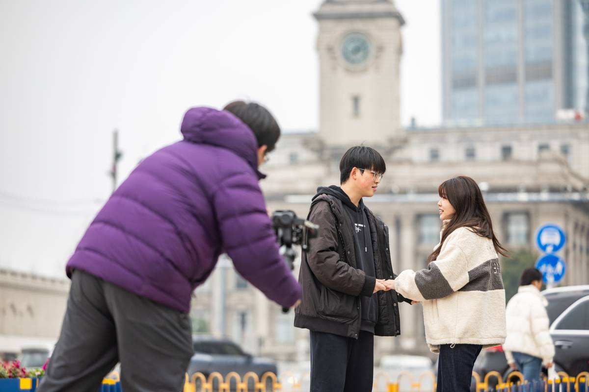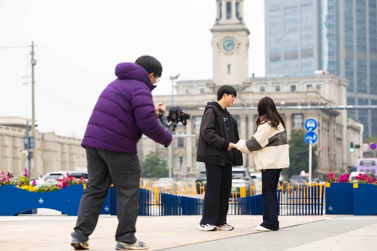 2026年2月27日,一个微短剧工作室团队在武汉江汉关前拍摄剧情内容。(湖北日报全媒记者 何宇欣 摄)