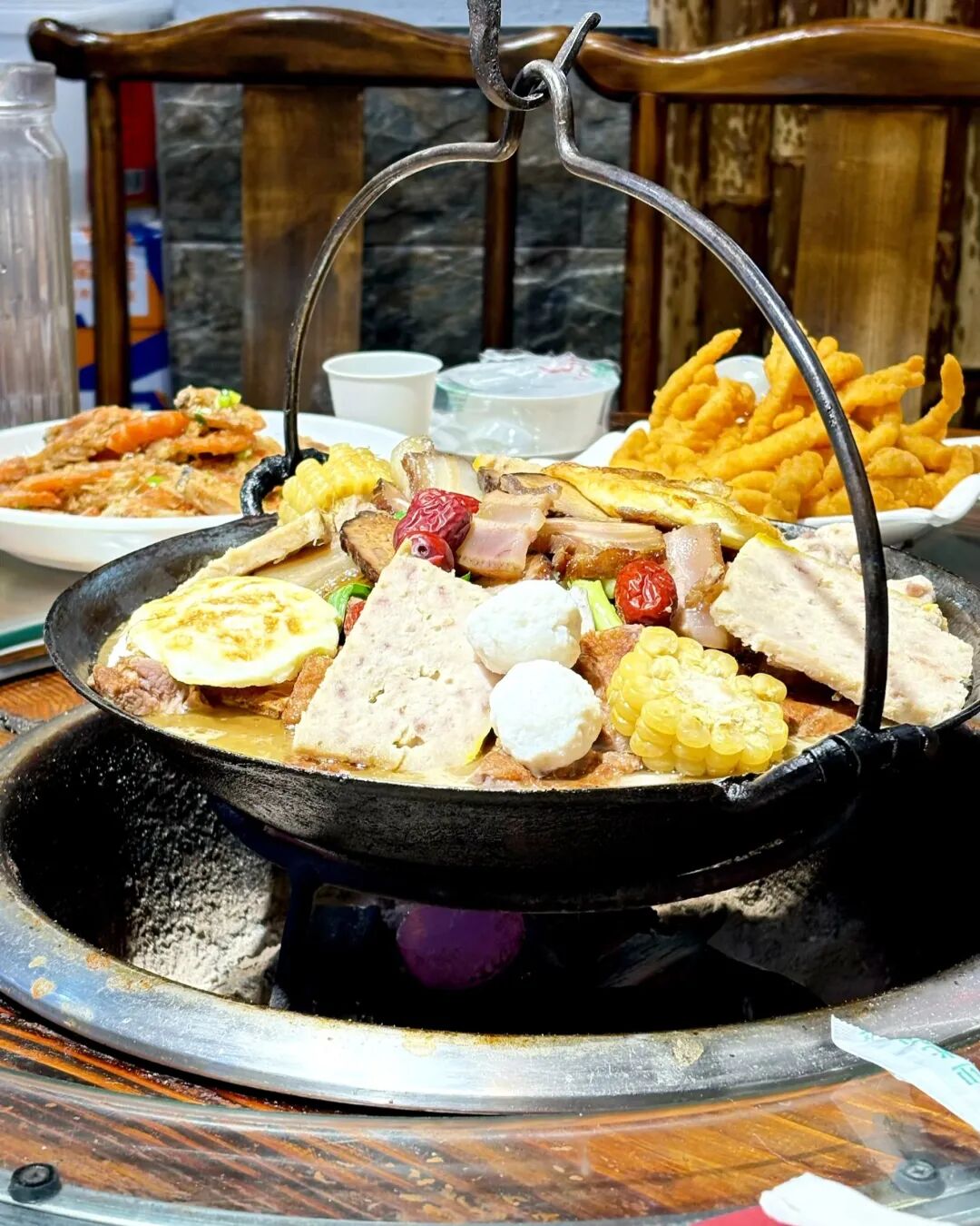 地道硬菜,解锁大别山豪迈!必吃天堂寨吊锅,腊肉、山笋、板栗、土鸡肉在柴火铁锅中咕嘟沸腾,汤汁浓郁,荤素交融,围坐火塘品尝,配上一杯醇厚老米酒酒,尽是山野的烟火豪情。