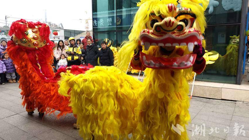 随着一声清脆的锣响,活动在驿站外拉开帷幕。一条黄色的长龙腾挪起舞,随后,两头威武的狮子摇头摆尾、活灵活现,引得围观群众连连喝彩。孩子们兴奋地拍手叫好,不少人举起手机记录下这热闹的场景。