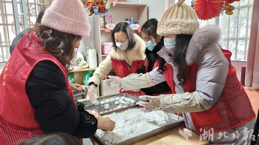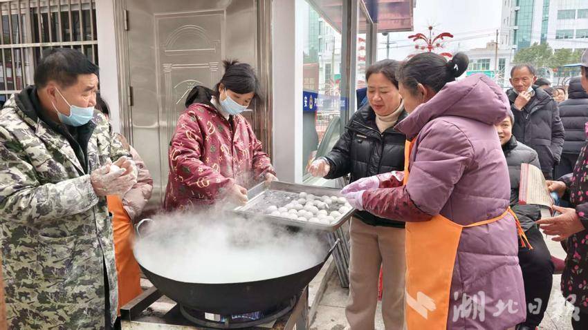 活动现场,社区工作人员和志愿者们忙得不亦乐乎。他们围坐在一起包汤圆、煮汤圆,随后将一碗碗热气腾腾的汤圆分发给居民、环卫工人以及外卖骑手。