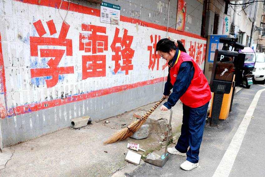 楚藩大道上车来车往,光明巷里居民们也开始了日常的忙碌。志愿者们一到,便立刻拿起扫帚、簸箕等清扫工具,投入清扫工作。其中一位志愿者,弓着身子,细致地将路边角落的落叶和尘土一点点扫到一起,哪怕是被风吹到隐蔽墙角的小纸片,也逃不过他的眼睛,他认真地把它们扫进簸箕。另一位则推着垃圾车,默契地跟在清扫同伴身后,及时清运垃圾。他们动作娴熟且专注,不一会儿,额头就布满了细密的汗珠,但眼神里始终透着坚定。