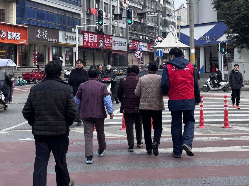 就在清扫过程中,青年志愿者翟雨贤留意到一位老奶奶正站在街边,看着川流不息的车辆,面露犹豫,似乎想要过马路却又有些害怕。他立刻放下手中的工具,快步走到老奶奶身边,亲切地说:“奶奶,我扶您过马路吧。”说着,便小心翼翼地搀扶着老奶奶,一边留意往来车辆,一边慢慢陪着老奶奶走到马路对面。老奶奶感激地连声道谢,小翟笑着回应:“奶奶,您别客气,这都是我们应该做的。”