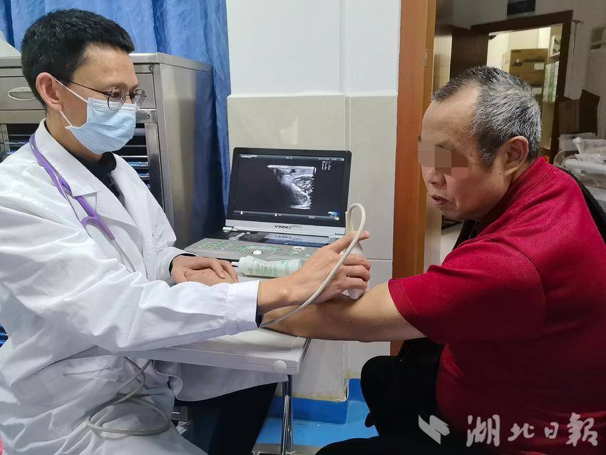 湖北日报客户端讯(通讯员张莉、牟傲)2月4日,利川市人民医院肾病内分泌科,周礼平医生正为透析患者检查“内瘘”。“我每周透析3次,‘内瘘’就是命根子,多亏周医生,我再不用往外跑了。”来自柏杨坝镇栏堰村谭先生紧握周礼平的手,满脸感激。