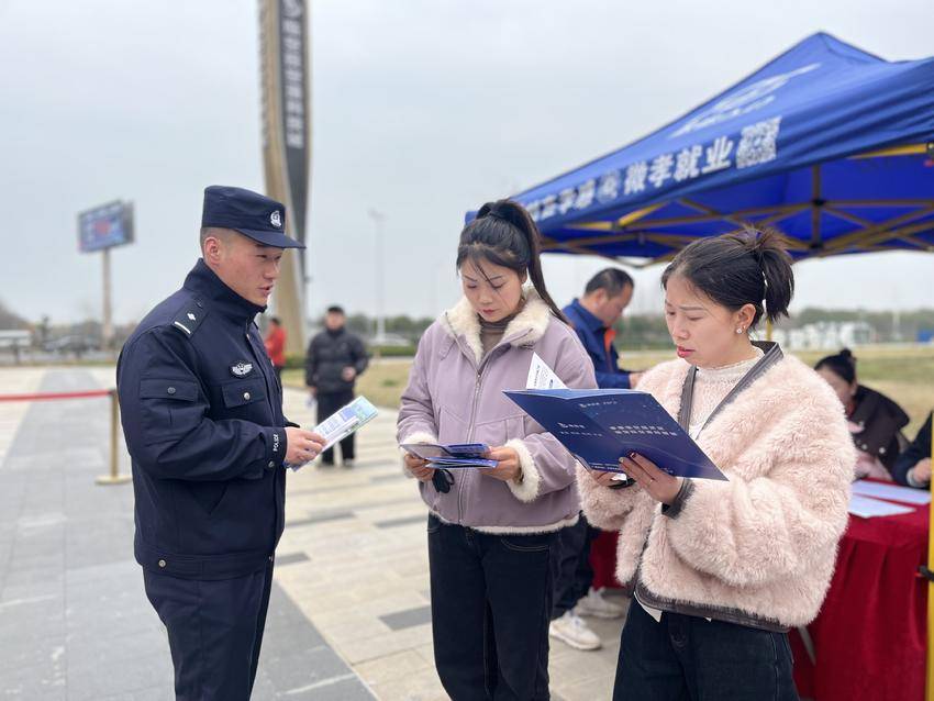 为保障招聘会安全有序开展,临空派出所、城管执法大队、交警中队组建专项保障队伍,实时排查安全隐患、疏导现场人流、妥善处置突发情况,全力维护现场秩序。派出所民辅警将安保、服务与宣防工作深度融合,在为群众指引路线、答疑解惑的同时,结合求职招聘期间的高发风险,通过发放宣传资料、面对面讲解等方式开展反诈宣传,重点提醒群众警惕虚假招聘、培训贷等骗局,切实守护群众财产安全,让平安成为本次招聘会最温暖的底色。