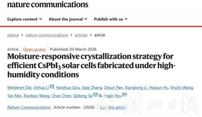湖北日报讯(记者李玉麟、通讯员鲜文涛)近日,湖北大学李金华、王贤保教授团队联合武汉大学、中国科学院半导体研究所专家,在国际期刊《Nature Communications(自然-通讯)》发表研究成果。他们攻克了无机钙钛矿太阳能电池怕潮湿的难题,实现高湿环境下高效制备,为其规模化生产铺平了道路。
