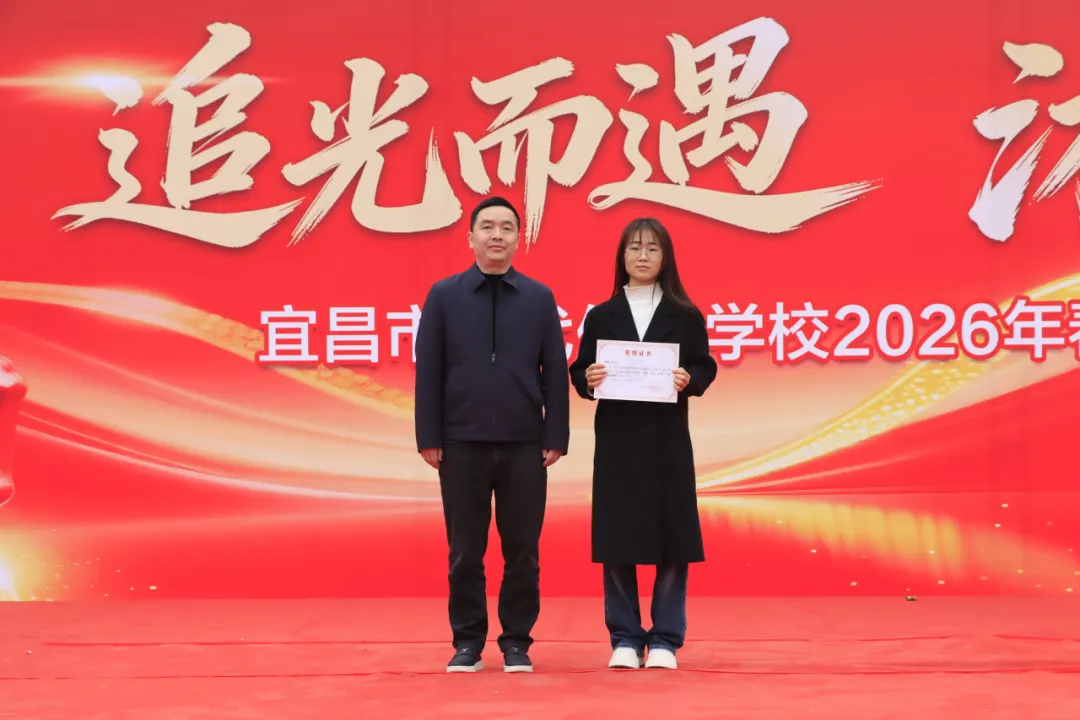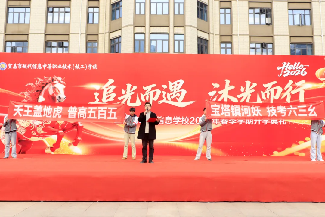 春潮涌动启新章,桃李芬芳向未来。近日,宜昌现代信息学校全体师生齐聚校园,隆重举行2026年春季开学典礼,共同开启新学期的逐梦征程。宜昌现代教育集团董事长、党支部书记田水荣,集团总经理胡一杰,集团董事朱爽,现代信息学校党支部副书记、校长吴昌钧,督学李朝晖,副校长肖飞及各处室主任出席本次典礼。典礼由教师汪煜韩与学生黄梦娇联袂主持。