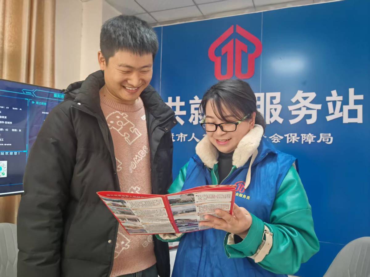 南营街道党群服务中心工作人员陈文文正(右)在给求职者介绍就业政策。(湖北日报全媒记者 刘孝军 摄)
