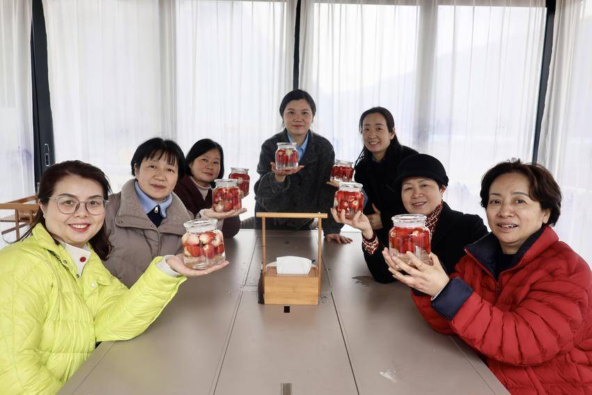 随后,大家在马倌屯慢时田园餐厅开启果酒制作体验。负责人王琴耐心地讲解步骤,大家围坐一桌,清洗、去蒂,将草莓与冰糖层层错落铺入瓶中,装酒封瓶。平日里职场的干练利落,此刻都化成手作时的鲜活趣味。