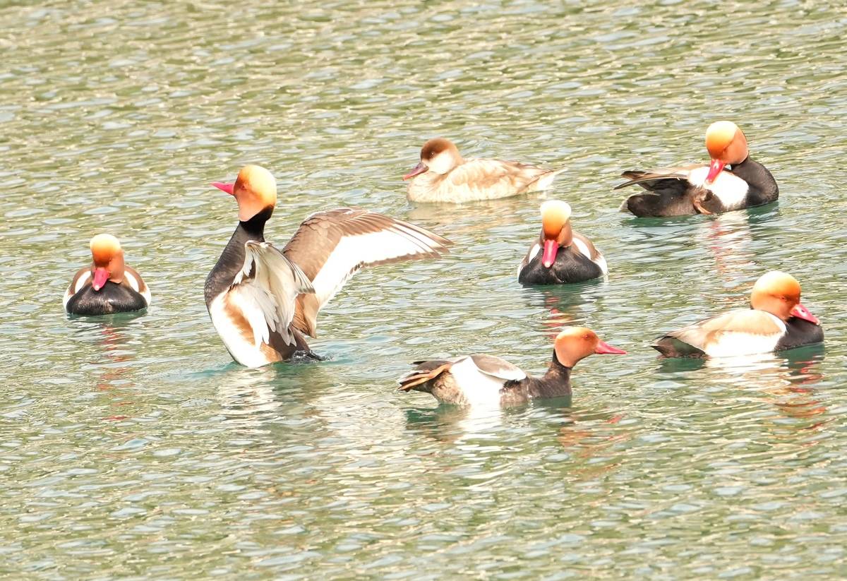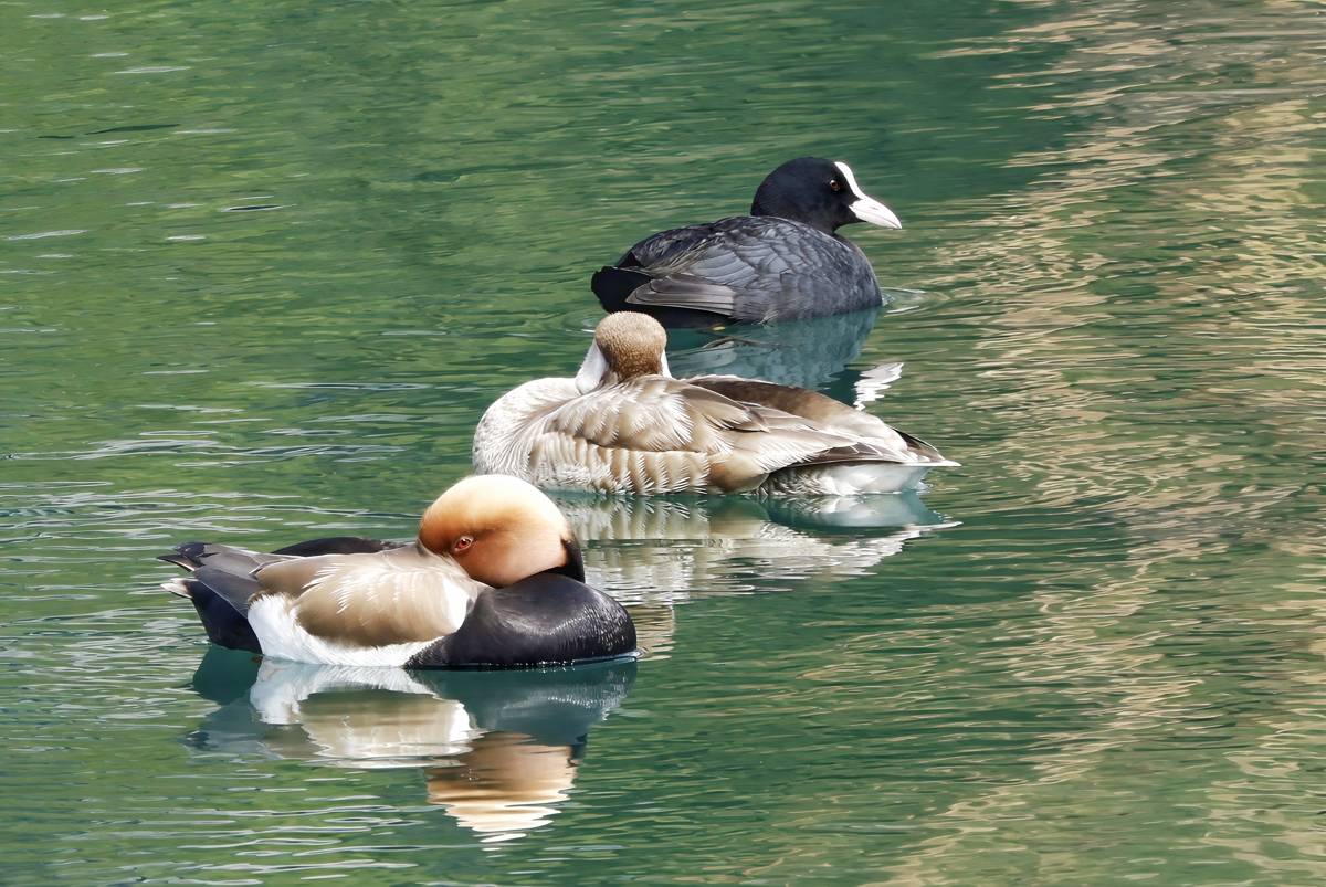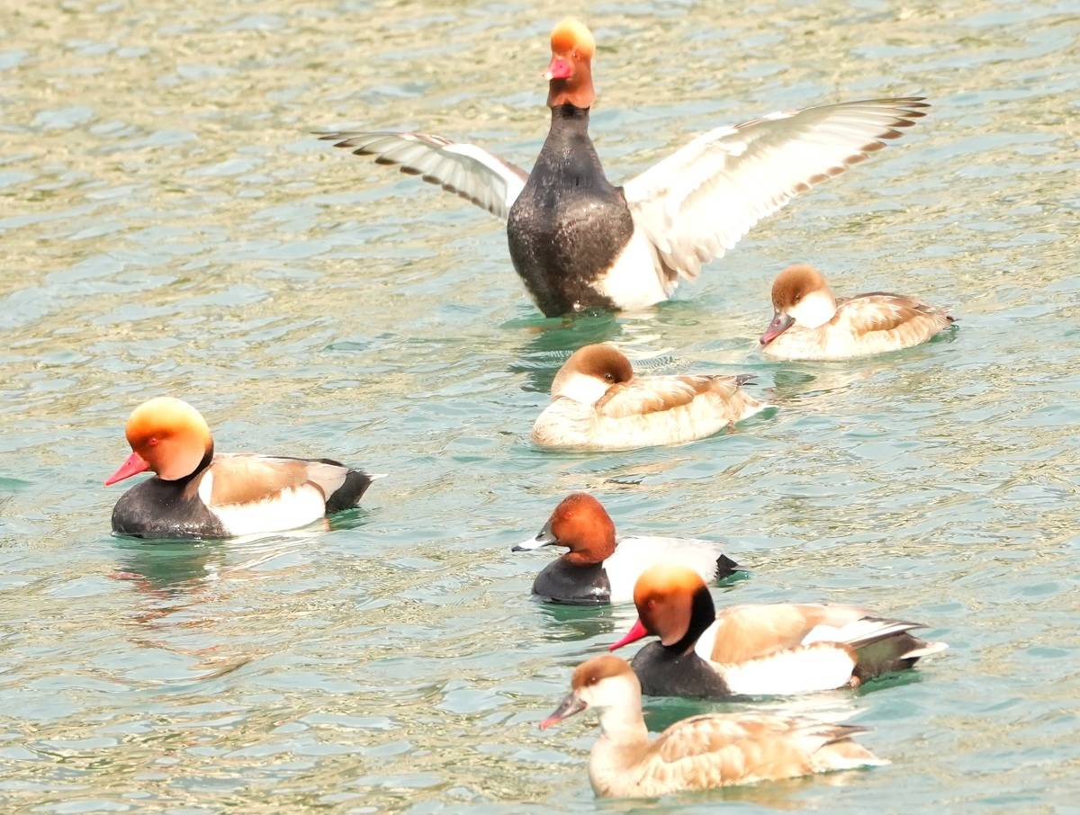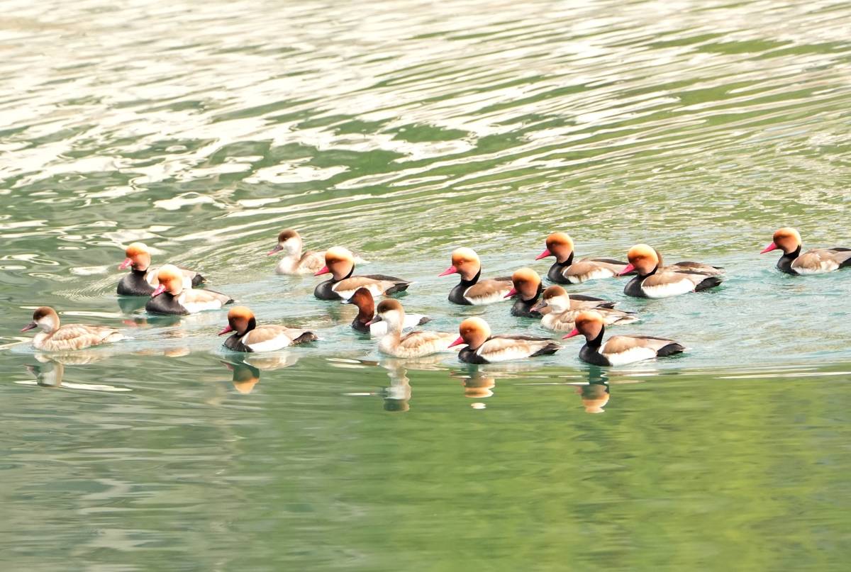 赤嘴潜鸭红嘴亮眼,雄鸭浓栗色的头顶缀着淡棕黄色羽冠,褐、白、黑相间的翅膀衬着漂亮尾羽,在碧波中格外夺目,它们时而潜入水中取食,时而静静漂浮在水面梳理羽毛,尽显憨厚灵动本色。