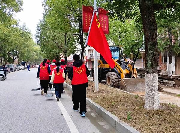 活动中,团员们身着统一的红色志愿马甲,在团旗的引领下,手持扫帚、铁锹等劳动工具,对学校周边的社区街道、绿化带和公共区域进行了全面清扫。大家分工协作、干劲十足,有的清理路面垃圾,有的铲除杂草,有的擦拭公共设施,不放过任何一个卫生死角。
