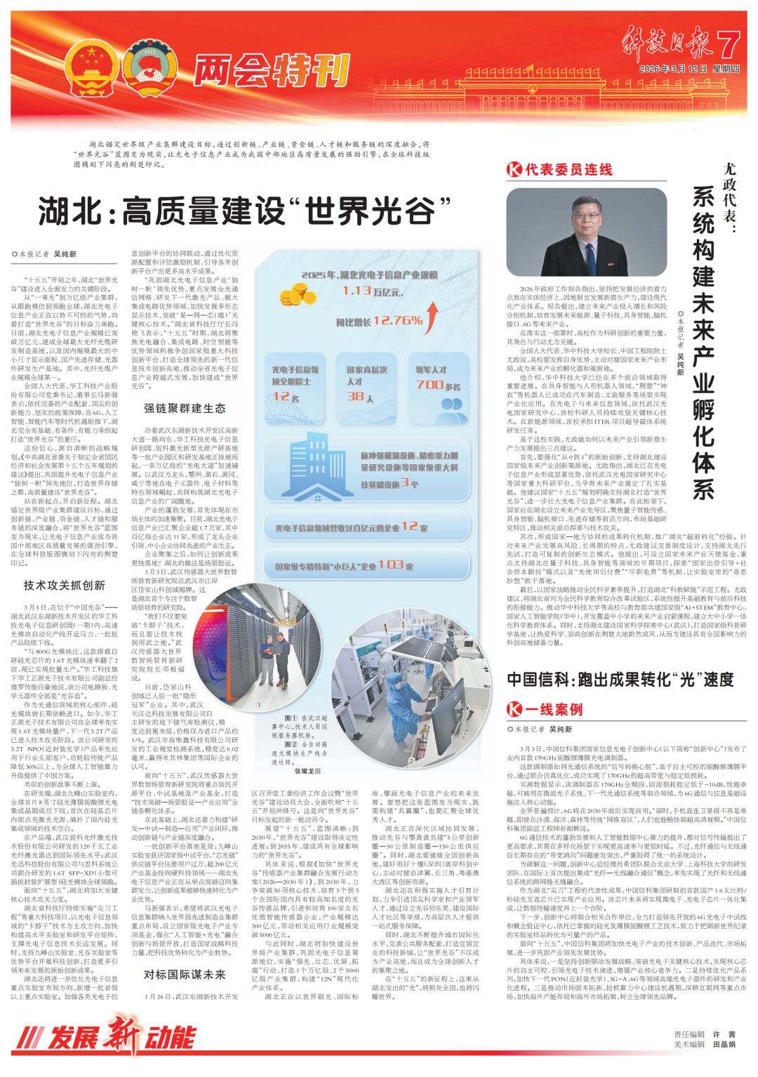 3月12日,《科技日报》两会特刊刊发整版报道《湖北:高质量建设“世界光谷”》,以下为全文转载。
