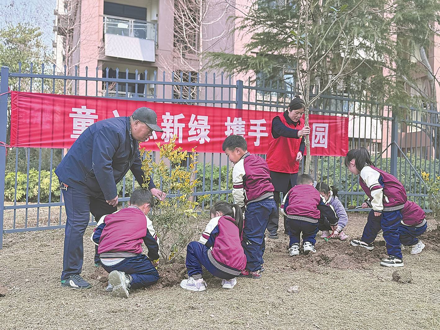 3月11日上午,市住新局第一房管所联合尹集社区、沁德物业、沐恩幼儿园,在尹集紫薇学府公租房小区开展植树节主题活动。图为植树现场。(来源:襄阳日报