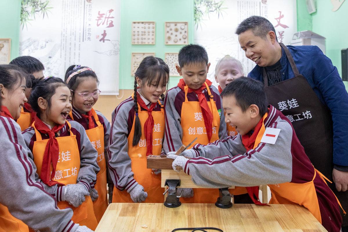 校长金高明说,学校将分散在教学楼低层的10余间教师办公室,整合后集中迁移到高层,硬是“挤”出两间近百平方米的独立空间,改造成劳动教室,配齐全套专业工具与安全设备,开展缝纫、木艺等劳动课。