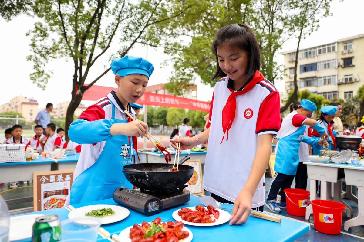 每月一次的校园厨师争霸赛上,学生们系上围裙,切菜、调味、颠勺,有模有样。