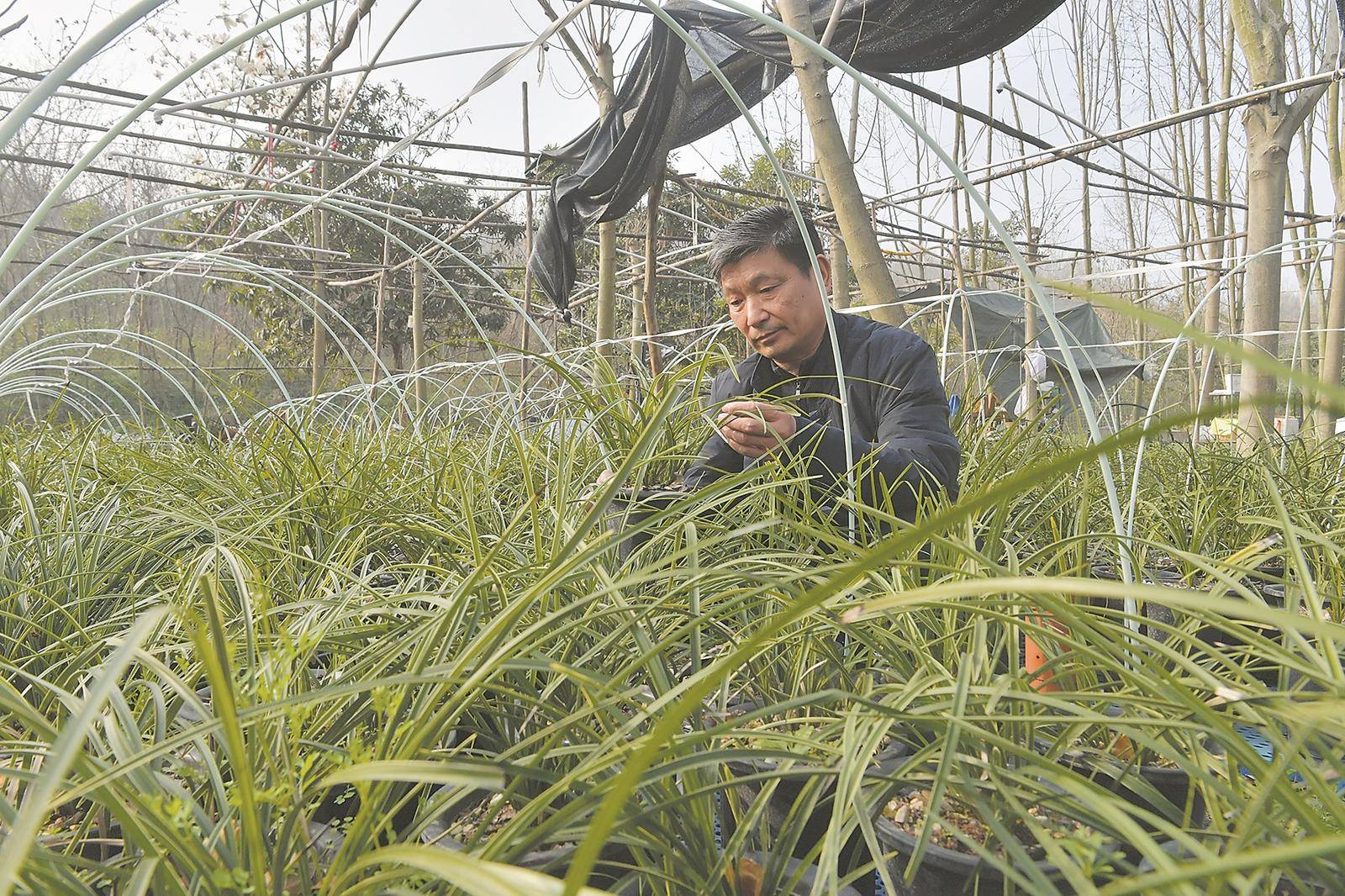 3月11日,在襄城区卧龙镇,兰花专业种植户冯万才认真察看林下栽种的兰花生长情况。