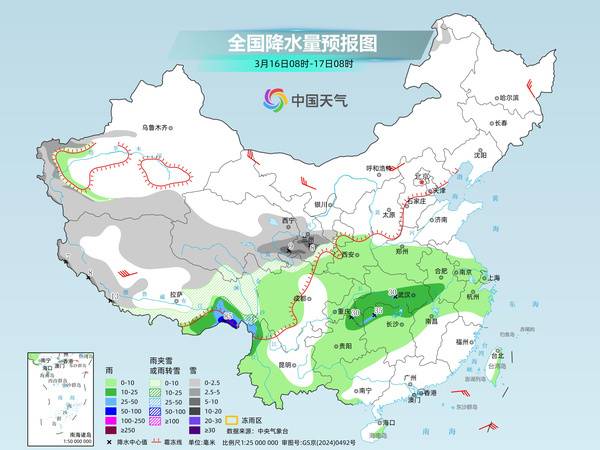 明天,新疆南疆山区、西藏大部、青海东部和南部、甘肃中南部、宁夏南部、内蒙古东北部等地部分地区有小到中雪或雨夹雪,其中,西藏南部、青海东部、甘肃南部等地部分地区有大到暴雪。西藏东南部、四川盆地东北部、云南西部和南部、贵州、重庆、江汉、江淮、黄淮南部、江南西部和北部、陕西南部、广西西北部等地部分地区有小到中雨,其中,重庆东南部、湖南西北部、湖北中部、西藏东南部等地部分地区有大到暴雨。