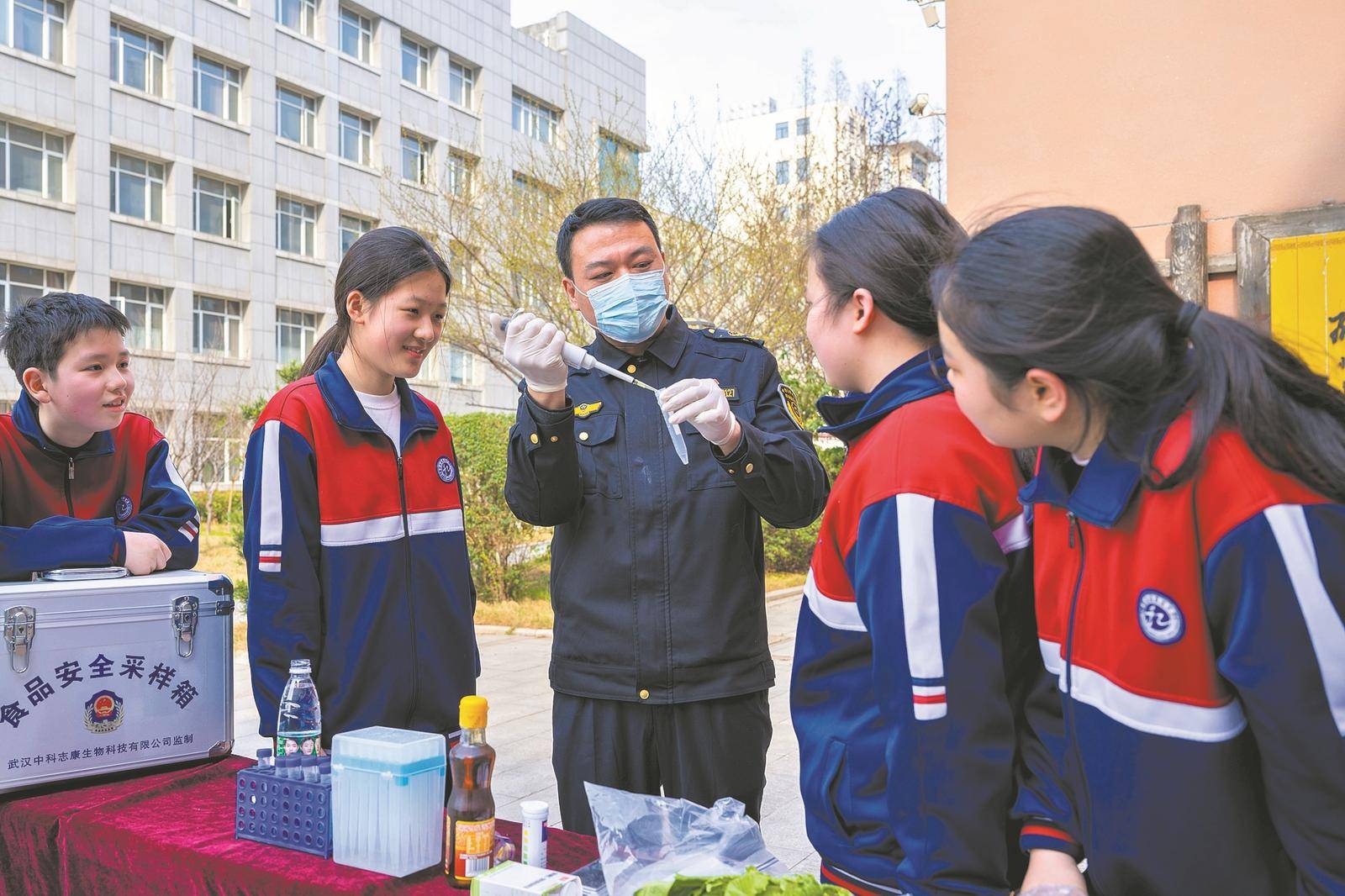 3月13日,在3·15国际消费者权益日到来之际,市诸葛亮中学联合樊城区市场监督管理局开展消费者权益日宣传活动。活动中,樊城区市场监督管理局的工作人员通过蔬菜快检、教学生如何辨别食品包装、普法宣传等形式,向学生们讲解食品安全知识。(来源:襄阳日报 李旭晖 通讯员 张付军 李东阳 摄)