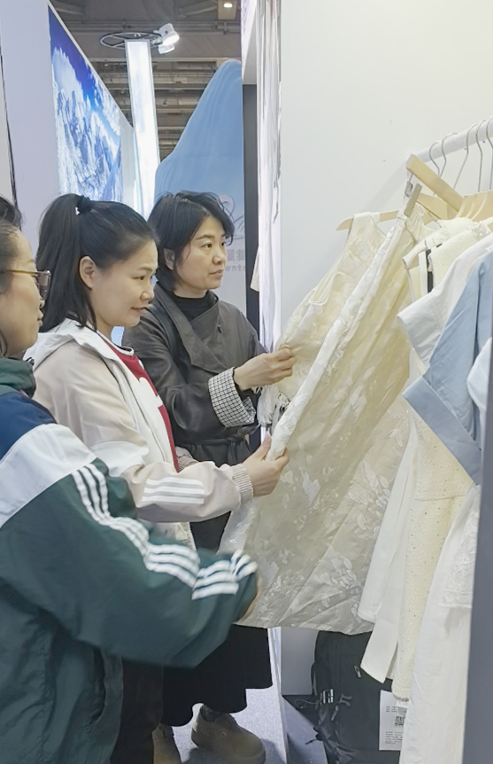 展会期间,天门特色展位人气持续高涨。参展企业集中展示了最新研发设计成果、市场爆款服饰及特色定制产品,从日常休闲装、时尚成衣到智能健康服饰、高端定制款,品类丰富、风格多元,工作人员向前来选品采购、洽谈合作的海内外客商、时尚买手进行细致讲解与现场推介。