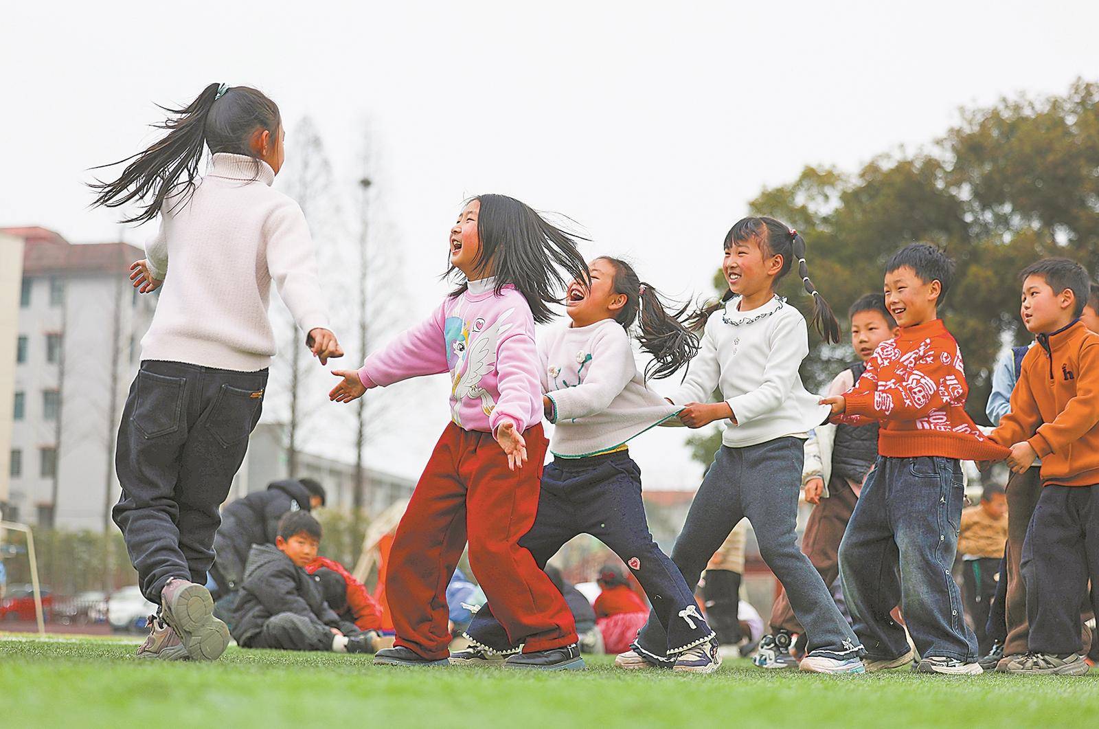 近日,樊城区竹条中心小学的学生们在操场上开展老鹰捉小鸡、跳绳、踢足球等体育活动,乐享大课间欢乐时光。(来源:襄阳日报