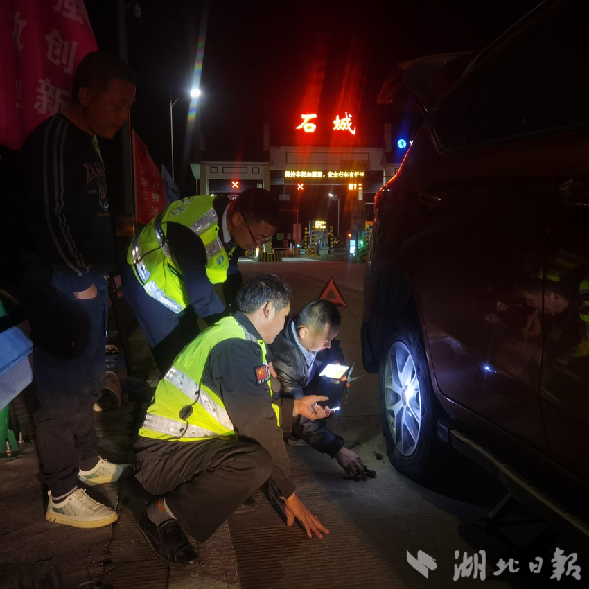 湖北日报客户端讯(通讯员 吴光昊 周小游)夜幕之下,高速暖情。3月17日19时许,湖北交投石城管理所收费站出口上演暖心一幕,当班收费人员化身“临时修理工”,深夜紧急为突发车辆故障的司乘更换轮胎,以高效贴心的服务为司乘排忧解难,用实际行动诠释高速服务的温度与担当。