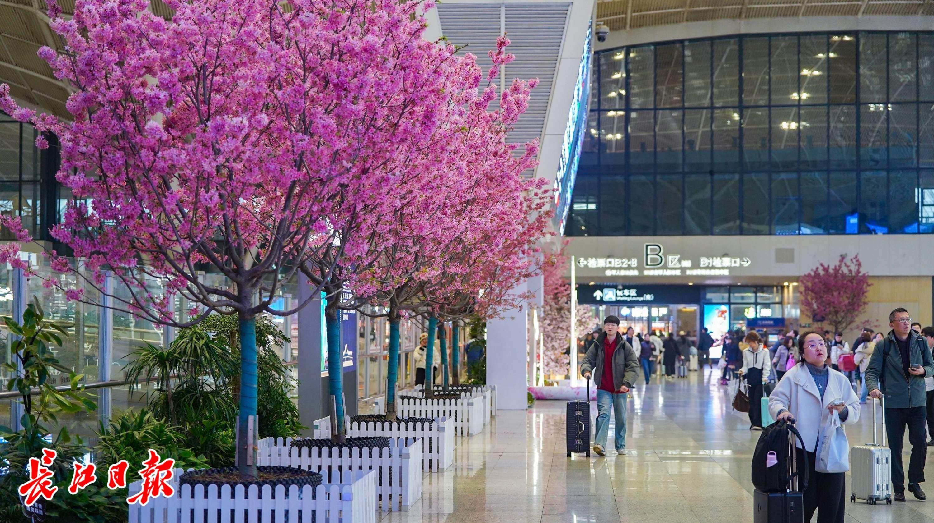 武汉火车站内的樱花成一道亮丽风景。 记者李子云 摄